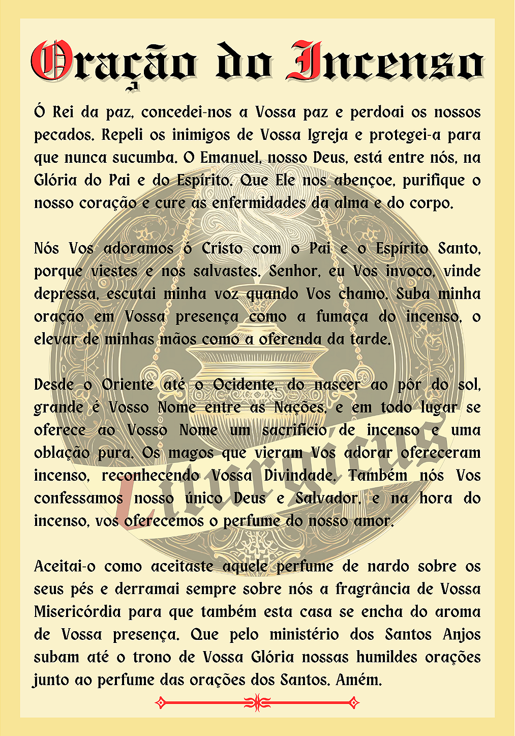 Há séculos, os católicos do Oriente, particularmente os da Tradição Copta recitam esta bela oração ao queimar incenso durante as suas devoções. Abaixo, dispomos a oração completa em texto para aqueles devotos que desejam recitá-la.