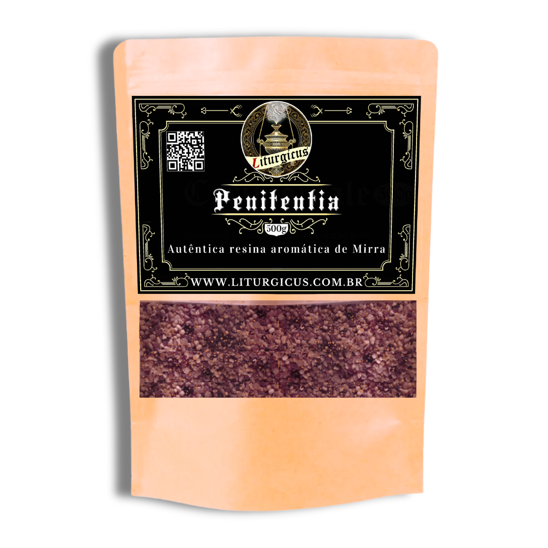 A Liturgicus apresenta com reverência o Incenso Penitentia: 100% mirra legítima, pura e não misturada, cuidadosamente tratada para uso litúrgico e devocional.